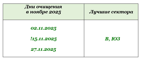В ноябре особенно эффективны дни для очищения 02, 15 и 27 ноября. А 15 ноября еще и с убывающей Луной совпадает, что дает дополнительный эффект.