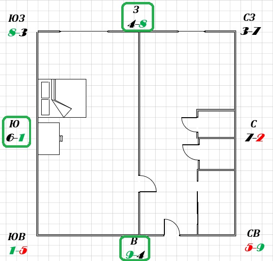 Особенно опасно, если энергии дублируются. Например, если спальня находится на Северо-Востоке (Юго-Востоке), входная дверь в комнату, квартиру на Северо-Востоке (Юго-Востоке), или кровать в комнате стоит на Северо-Востоке (Юго-Востоке). Поэтому, если у вас совсем нет возможности переехать в комнату с более благоприятными энергиями, постарайтесь, чтобы хотя бы кровать, рабочий стол не стояли в Северо-Восточном (Юго-Восточном) секторе данной комнаты.