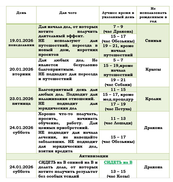 С 19.01.26 по 25.01.26 есть благоприятные дни, которые помогут в делах и активизация, которая повысит Вашу удачу: