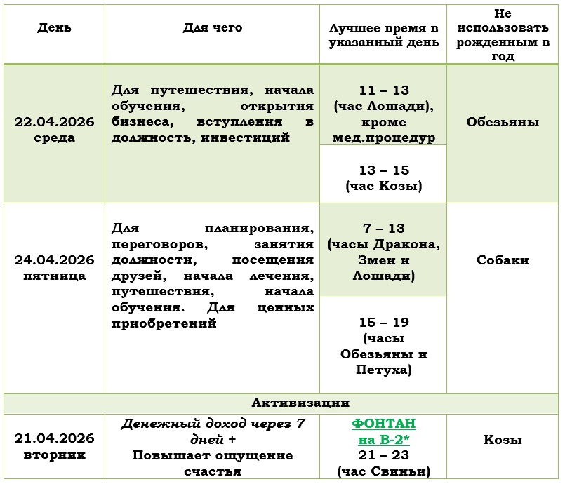 С 20.04.26 по 26.04.26 есть благоприятные дни, которые помогут в делах и активизация, которая повысит Вашу удачу: