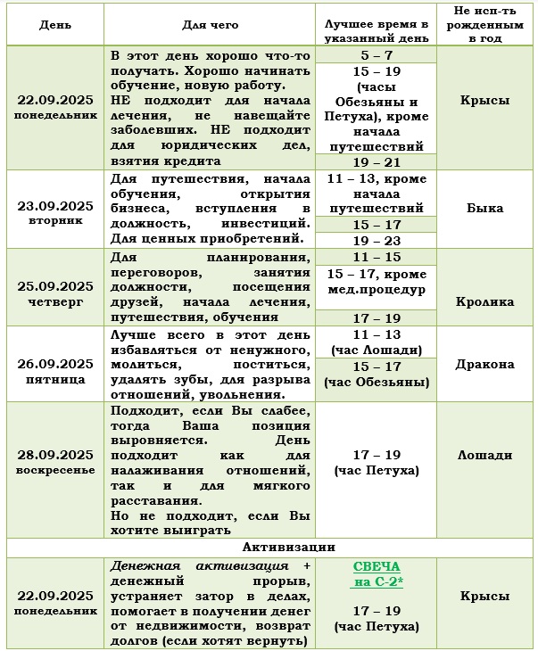 С 22.09.25 по 28.09.25 есть благоприятные дни, которые помогут в делах и активизация, которая повысит Вашу удачу: