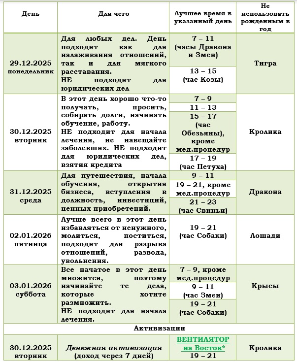 С 29.12.25 по 04.01.26 есть благоприятные дни, которые помогут в делах и активизация, которая повысит Вашу удачу:
